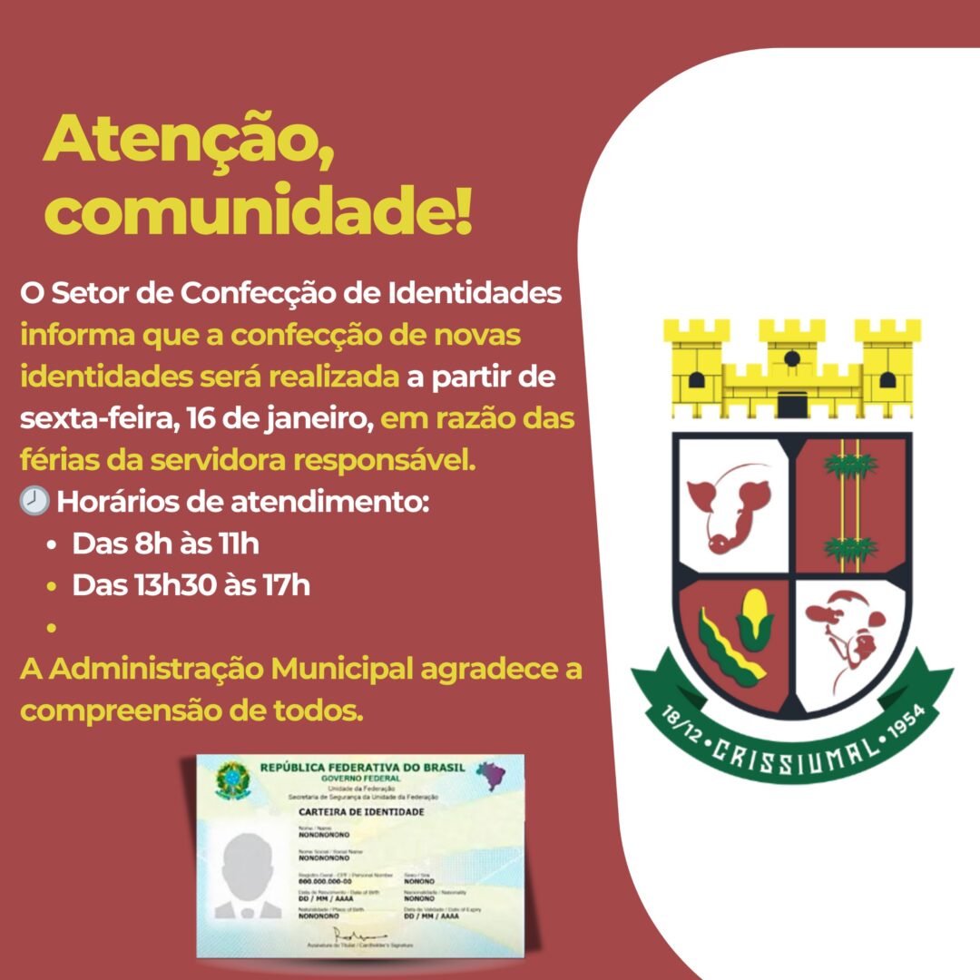 Atenção, comunidade! O Setor de Confecção de Identidades informa que a confecção de novas identidades será realizada a partir de...