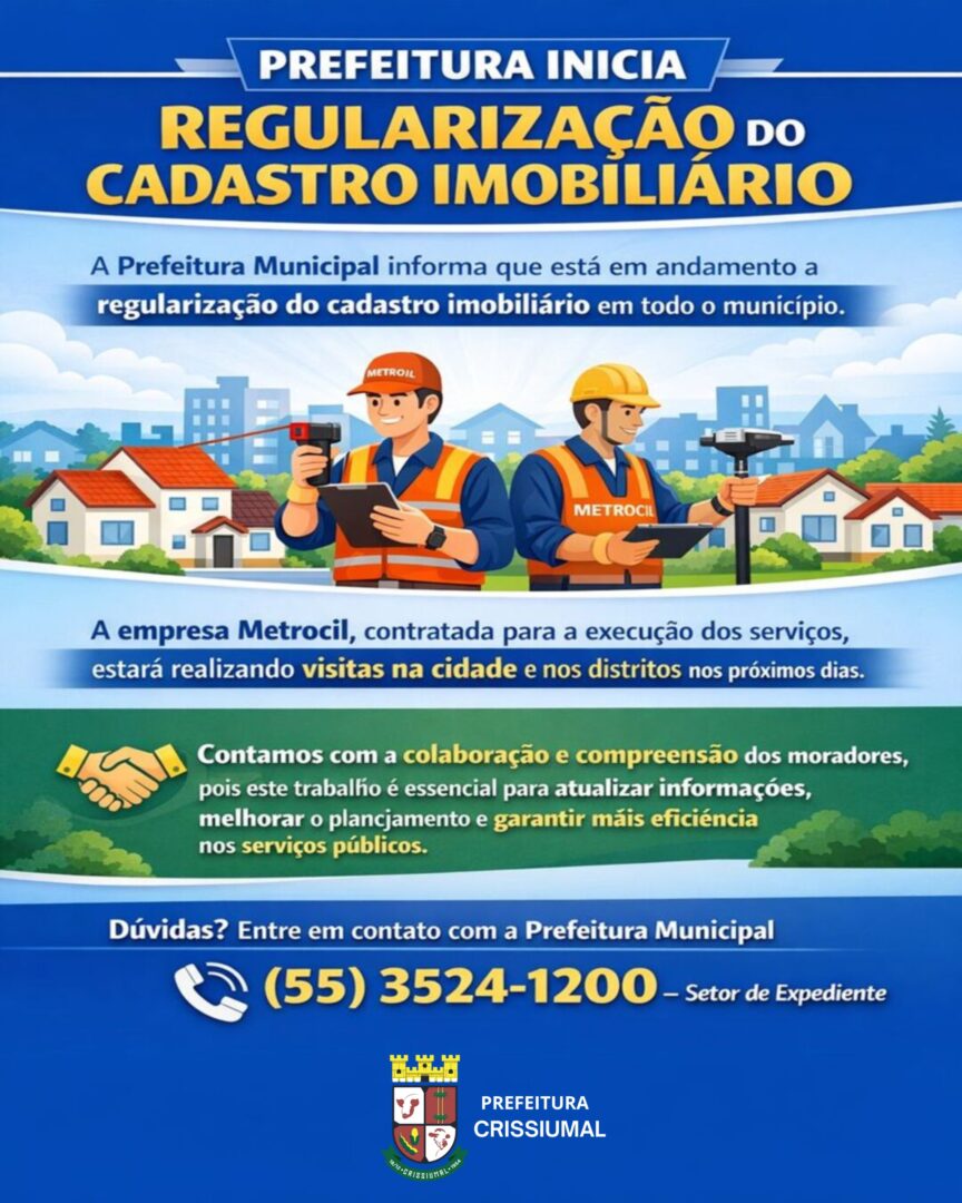 A Prefeitura Municipal informa que está em andamento a regularização do cadastro imobiliário em todo o município. A empresa Metrocil,...