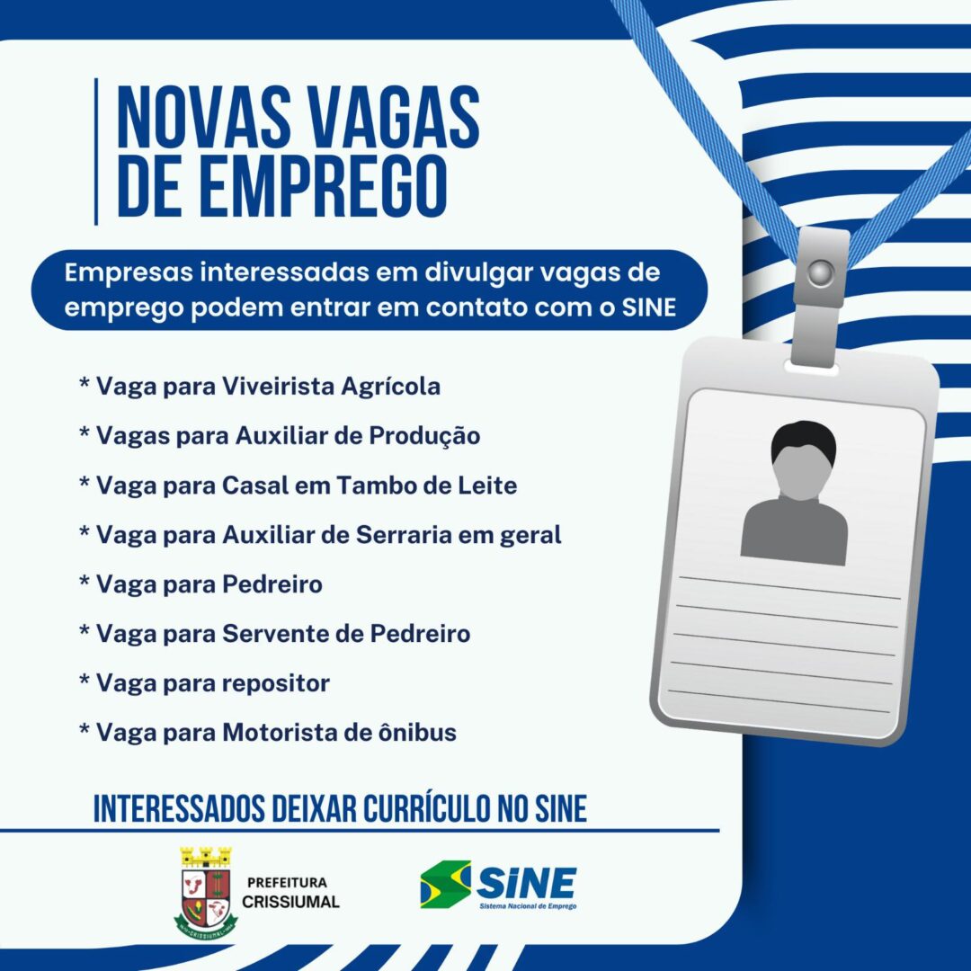 Novas Vagas de Emprego no SINE de Crissiumal!