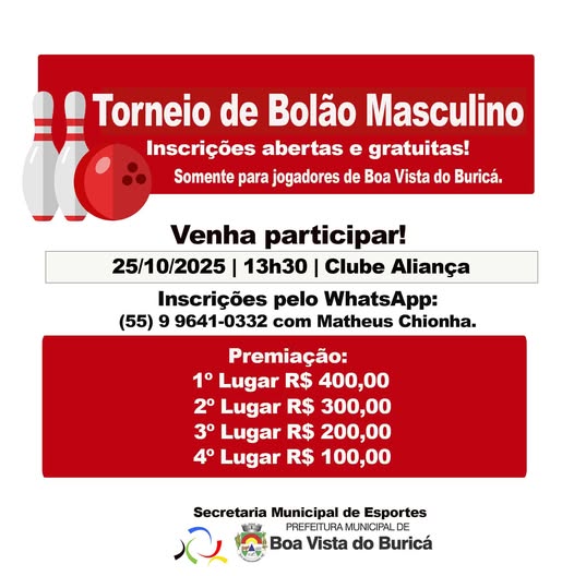 A Secretaria Municipal de Esportes convida todos os jogadores de Boa Vista do Buricá para participar do Torneio de Bolão Masculino, que...