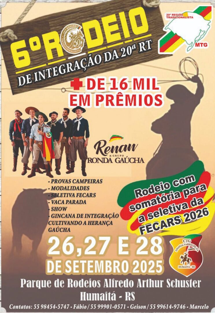 O município de Humaitá (RS) será palco, entre os dias 26, 27 e 28 de setembro de 2025, do 6º Rodeio de Integração da 20ª Região...