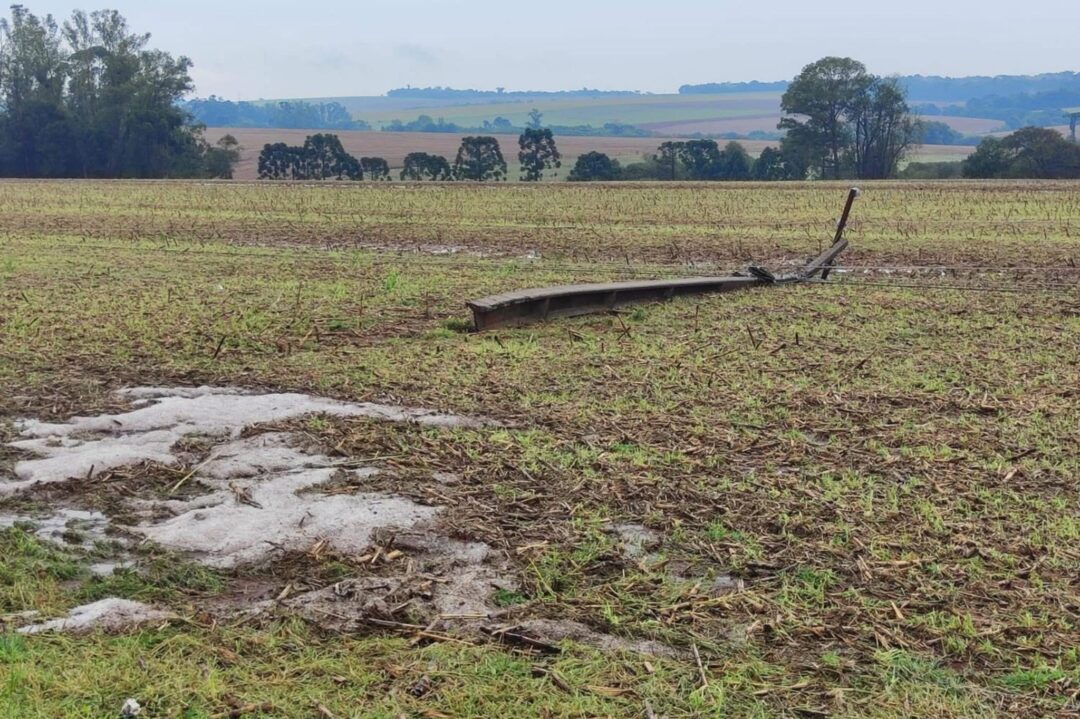 Temporal com queda de granizo, ventania e chuva forte atingiu o município de Tapera, no norte do RS, nesta quinta-feira (23). As pedras de gelo se acumularam às margens da RS-332, no início da tarde.