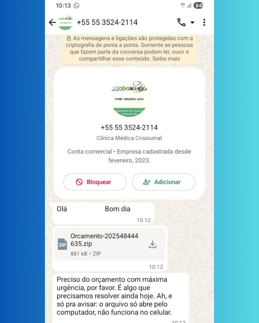 Comerciantes relataram ter recebido mensagens falsas com pedidos de orçamento, aparentemente legítimas, o que levou alguns a clicarem em links maliciosos. Um dos números utilizados pelos golpistas é o (54) 99622-6003.