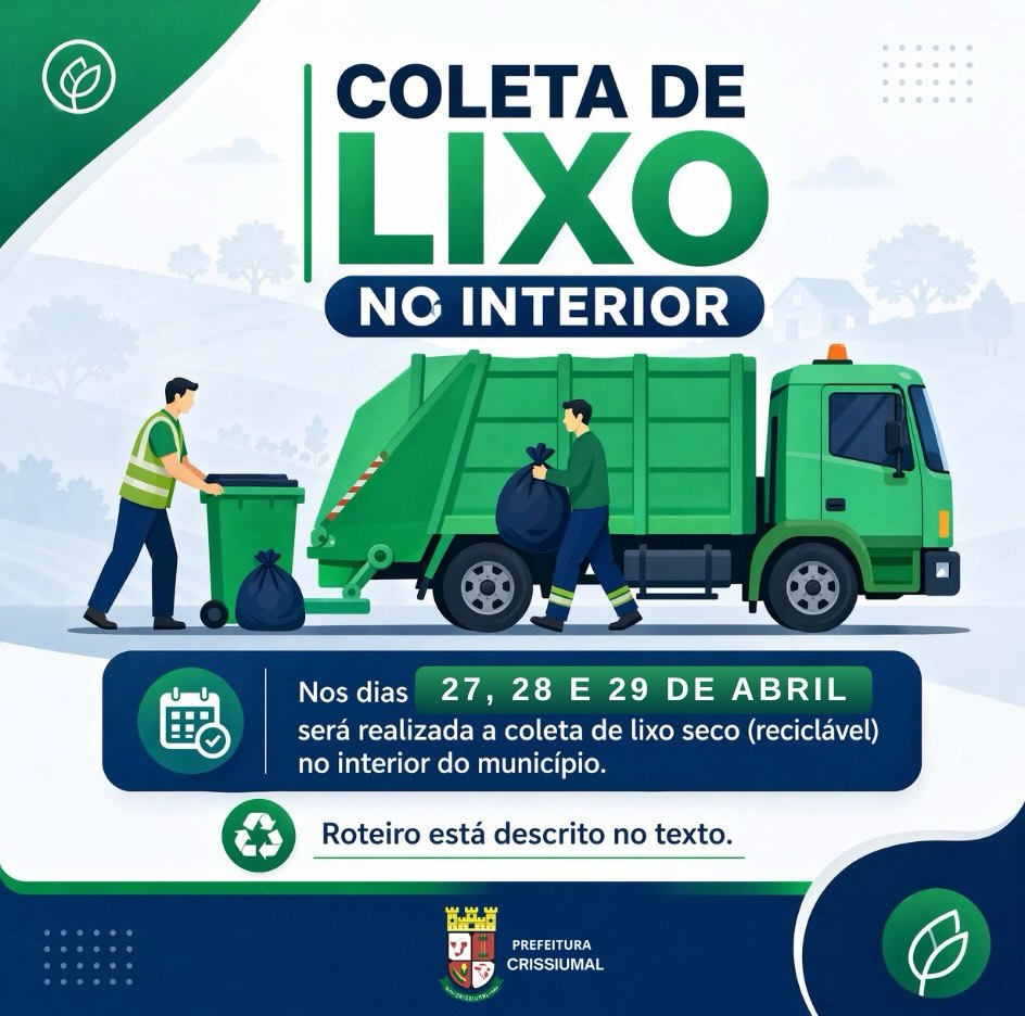 A Prefeitura de Crissiumal informa que nos dias 27, 28 e 29 de abril será realizada a coleta de lixo seco (reciclável) nas comunidades do interior, conforme o roteiro: