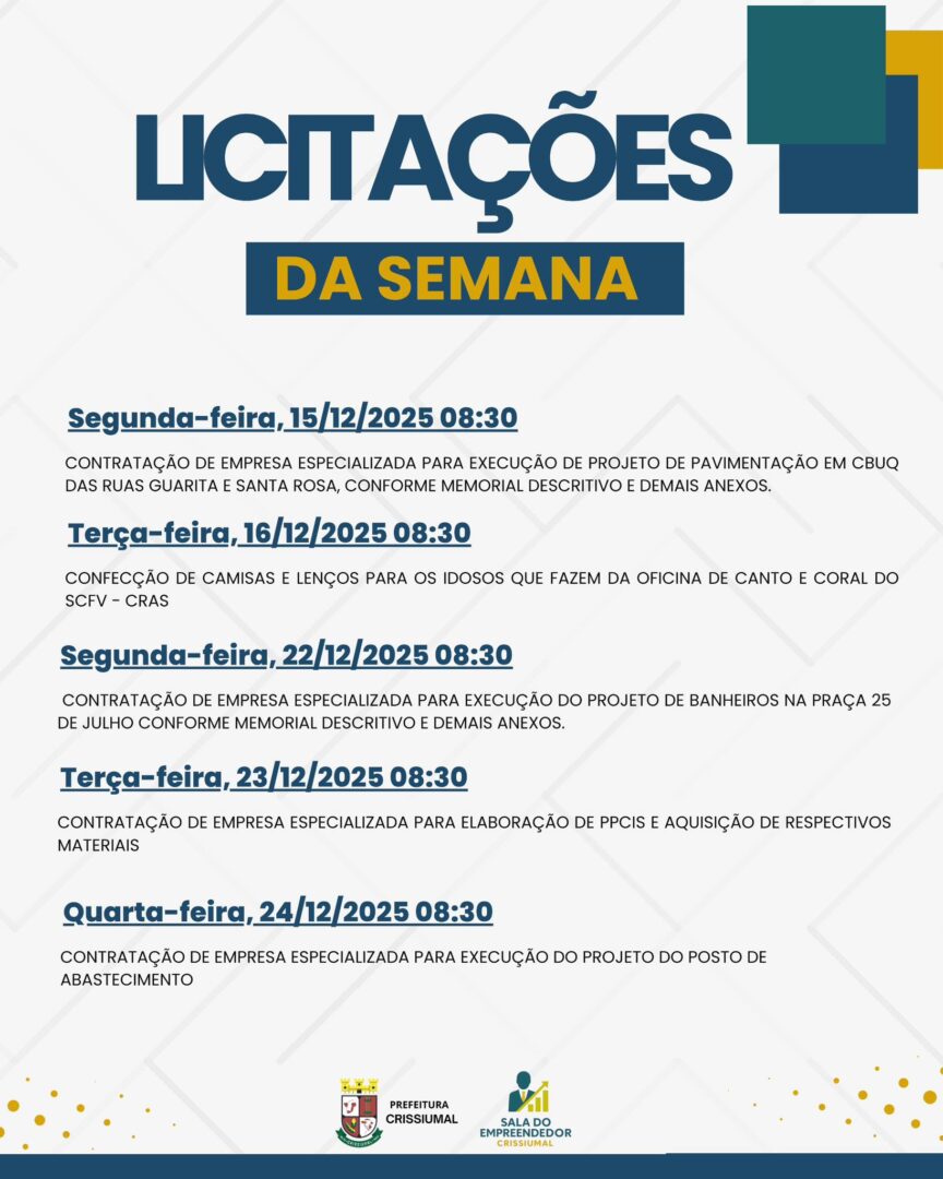 A Administração Municipal divulga as licitações programadas entre os dias 15 e 24 de dezembro de 2025. Confira a agenda: