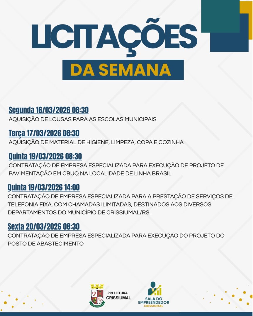 A Administração Municipal divulga as licitações programadas para os próximos dias, reforçando o compromisso com a transparência, organização e desenvolvimento do município. Confira a agenda: