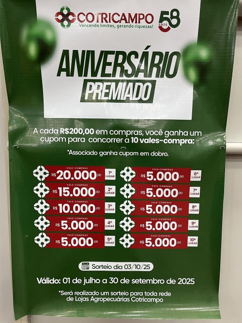 Já a campanha Aniversário Premiado das Lojas Agropecuárias, iniciada em julho, esteve válida até terça-feira, dia 30 de setembro. Ao todo, quase 60 mil cupons foram gerados. Lembrando que a cada R$ 200,00 em compras, os consumidores recebiam um cupom para concorrer. Os produtores associados à Cotricampo, tinham o direito de receber cupons em dobro.