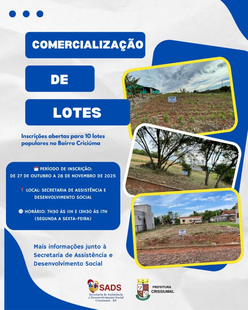 A Prefeitura de Crissiumal, informa à população que os terrenos, que fazem parte do Edital nº 386/2025, destinam-se à habitação popular, com valores subsidiados em até 50%, conforme o Decreto Municipal nº 184/2025.