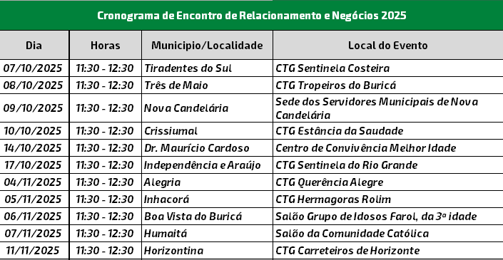 A partir deste mês de outubro, a agenda dos eventos contempla os municípios da região Noroeste do Rio Grande do Sul, e segue até 11 de novembro, consolidando o compromisso da Sicredi Confiança com o crescimento conjunto e transparente para construir um futuro mais próspero para todos.