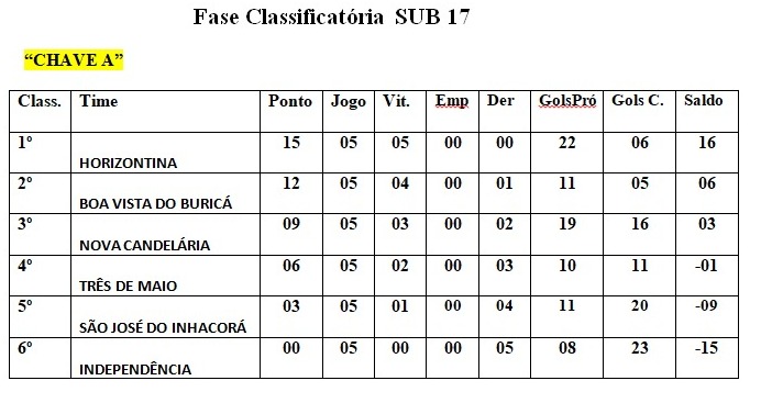 Ficaram fora da próxima fase São José do Inhacorá, com três pontos, e Independência, que encerrou a participação sem pontuar.