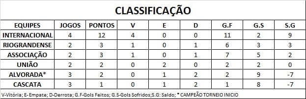Na abertura da tarde esportiva, o Internacional confirmou sua superioridade ao superar o Cascata por 3 a 0. A equipe contou com dois gols de Ederson Maas e um de Carlos Alexandre dos Santos para construir o placar. O destaque do confronto foi Ederson Maas, eleito o melhor jogador da partida.
