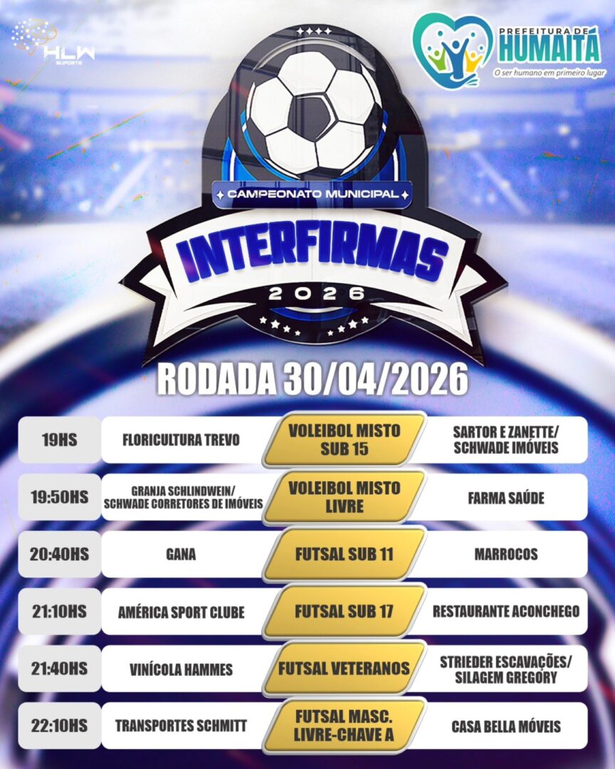 Nesta quinta-feira (30/04), o Ginásio Maria Cristina recebe mais uma rodada do Campeonato Municipal Interfirmas 2026. Venha prestigiar e torcer pelas equipes!