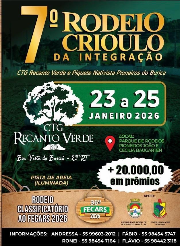 Tem início nesta sexta-feira (23) e segue até domingo (25) o 7º Rodeio Crioulo da Integração, em Boa Vista do Buricá. O evento é promovido pelo CTG Recanto Verde, em parceria com o Piquete Nativista Pioneiros do Buricá, e acontece no Parque de Rodeios Pioneiros João e Cecília Baumgarten, contando com pista de areia iluminada e estrutura preparada para receber competidores e público de toda a região.