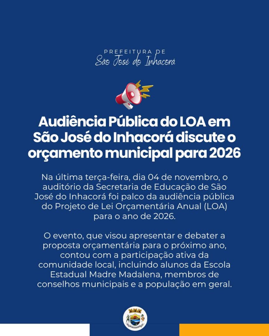 Na última terça-feira, dia 04 de novembro, o auditório da Secretaria de Educação de São José do Inhacorá foi palco da audiência pública do Projeto de Lei Orçamentária Anual (LOA) para o ano de 2026. O evento, que visou apresentar e debater a proposta orçamentária para o próximo ano, contou com a participação ativa da comunidade local, incluindo alunos da Escola Estadual Madre Madalena, membros de conselhos municipais e a população em geral.