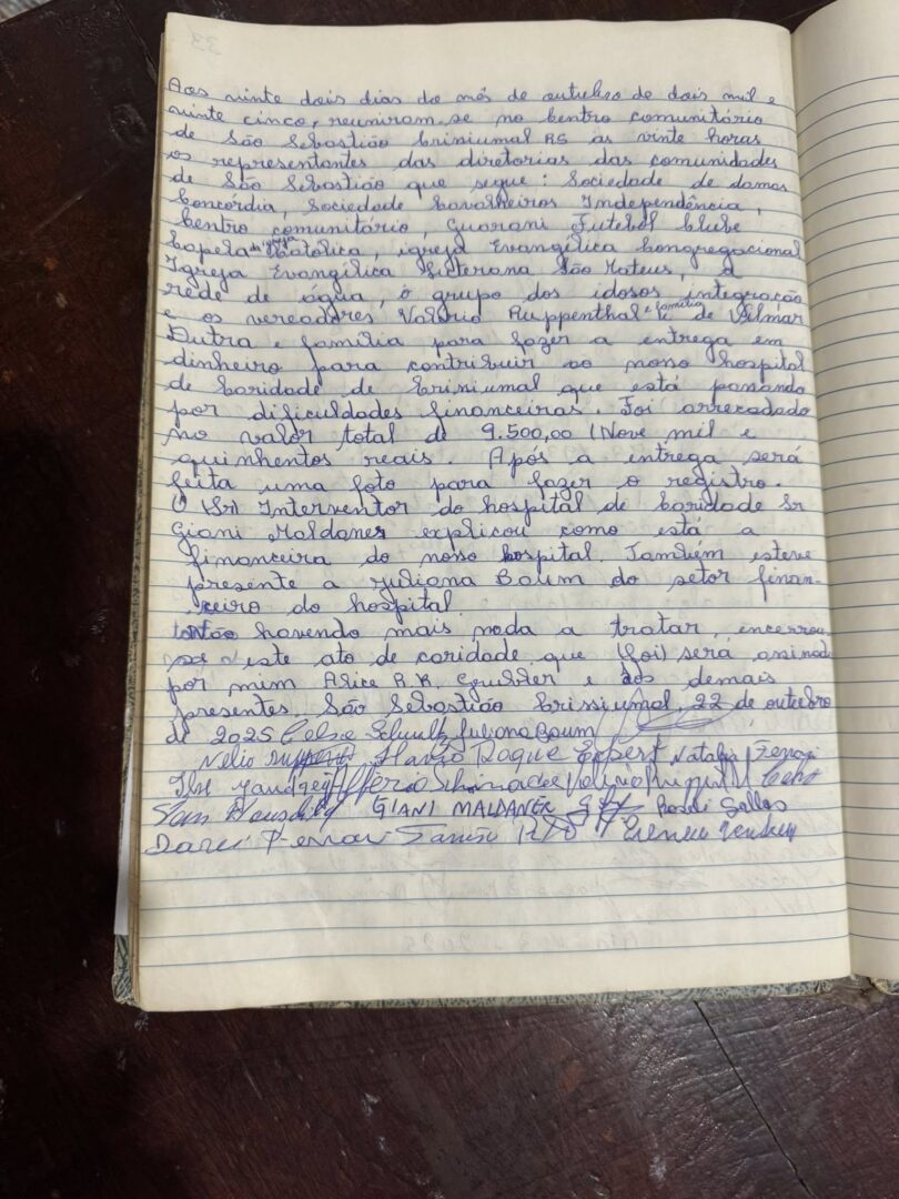O ato de entrega ocorreu na sede do Centro Social de São Sebastião, reunindo entidades e grupos locais que, unidos pela solidariedade e amor ao próximo, contribuíram para essa nobre causa. Participaram desse gesto coletivo o Guarani F. C., o Grupo de Idosos, a Sociedade de Damas, a Sociedade de Cavalheiros, a Água de São Sebastião, o Centro Comunitário, a Comunidade Católica, a Comunidade Congregacional e a Comunidade Luterana.