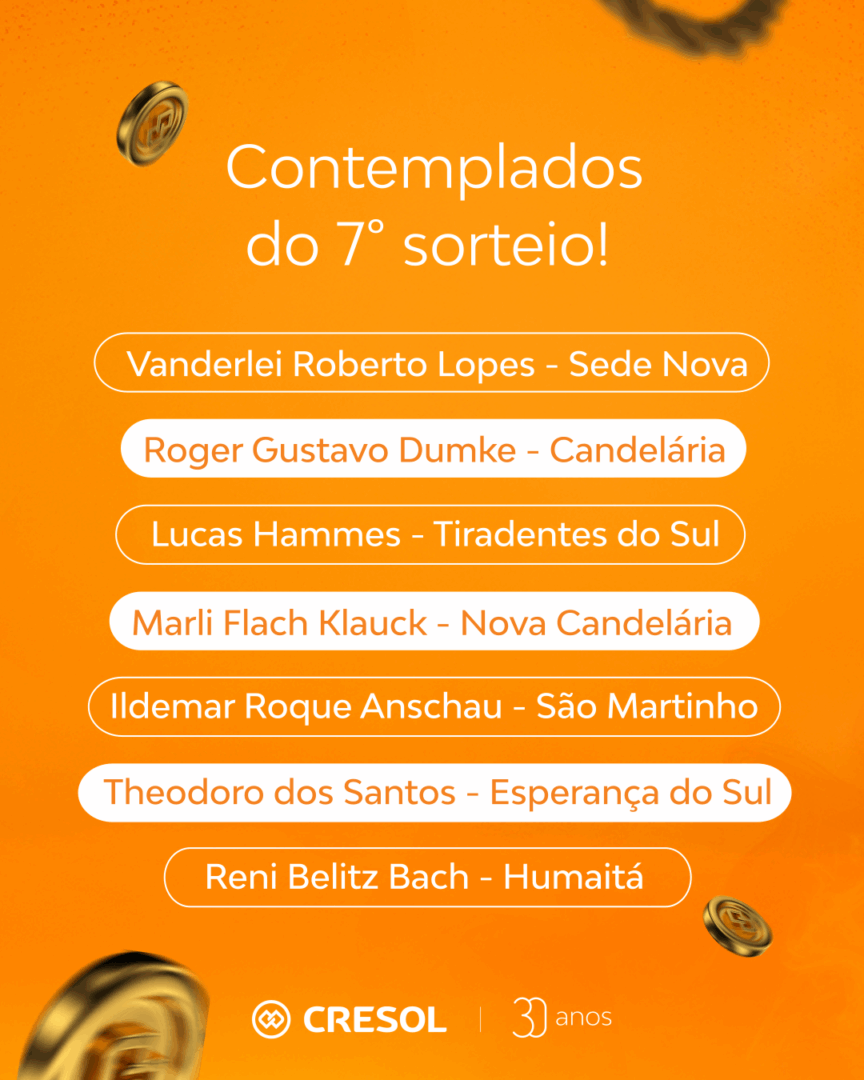 Nesta segunda-feira, 03 de novembro, a Cresol Cooperar, que atua nas regiões Noroeste e Vale do Rio Pardo, celebrou o sorteio de 7 prêmios, cada um no valor de R$1.500,00 em cartão de crédito.