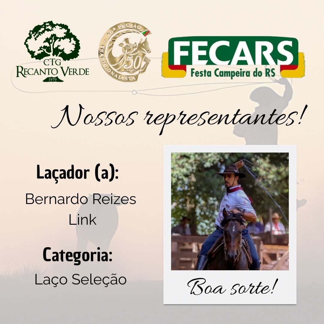 A diretoria do CTG divulgou a lista dos seus representantes oficiais que estarão competindo nestes quatro dias de intensa atividade campeira. Conheça quem levará a bandeira do Recanto Verde e de Boa Vista do Buricá para a FECARS.