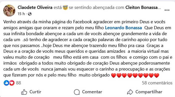Após a alta, a mãe dele fez uma postagem nas redes sociais agradecendo a Deus e amigos que oraram pelo filho. “Que Deus em sua infinita bondade abençoe a cada um de vocês, abençoe grandemente a vida de cada um […]. Jamais vou esquecer o carinho, a preocupação e as orações que fizeram por nós e pelo meu filho”, diz um trecho (leia abaixo).