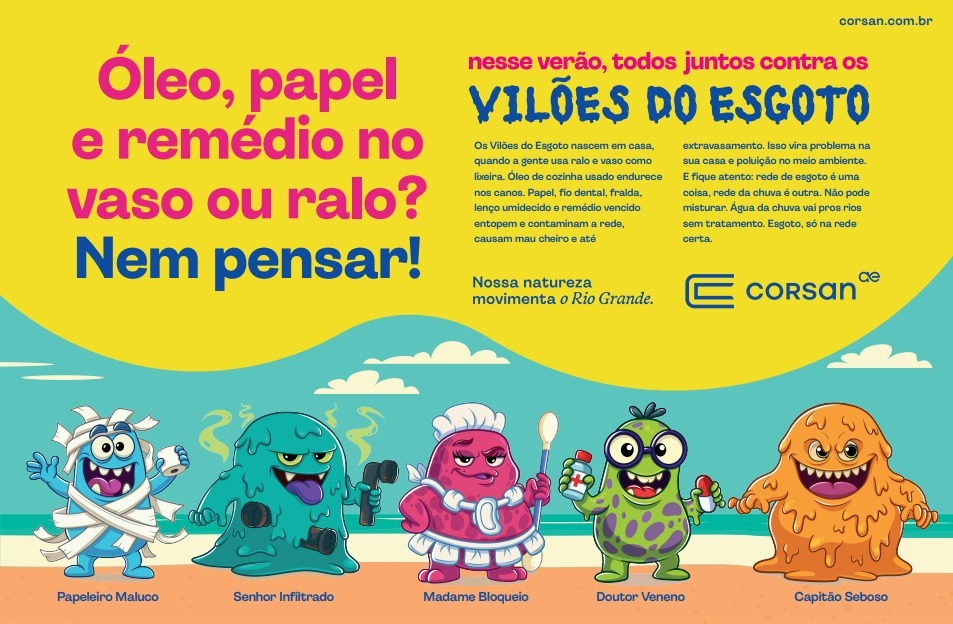 O Rio Grande do Sul será palco este ano de uma batalha divertida e necessária. A Corsan lança o movimento “Juntos Contra os Vilões do Esgoto”, que inicia no Litoral Norte, neste verão, e terá continuidade ao longo do ano nos municípios atendidos pela companhia. A iniciativa transforma orientações técnicas de saneamento em uma narrativa lúdica e educativa, voltada, inicialmente, a crianças, famílias e veranistas.
