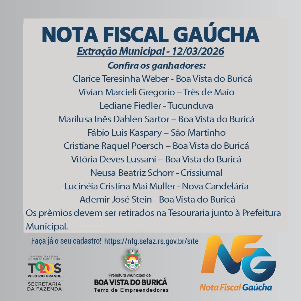 A extração municipal do programa Nota Fiscal Gaúcha, realizada no dia 12 de março de 2026, já tem seus ganhadores definidos. A iniciativa contempla consumidores que solicitam CPF na nota fiscal, incentivando a cidadania fiscal e a arrecadação no município.