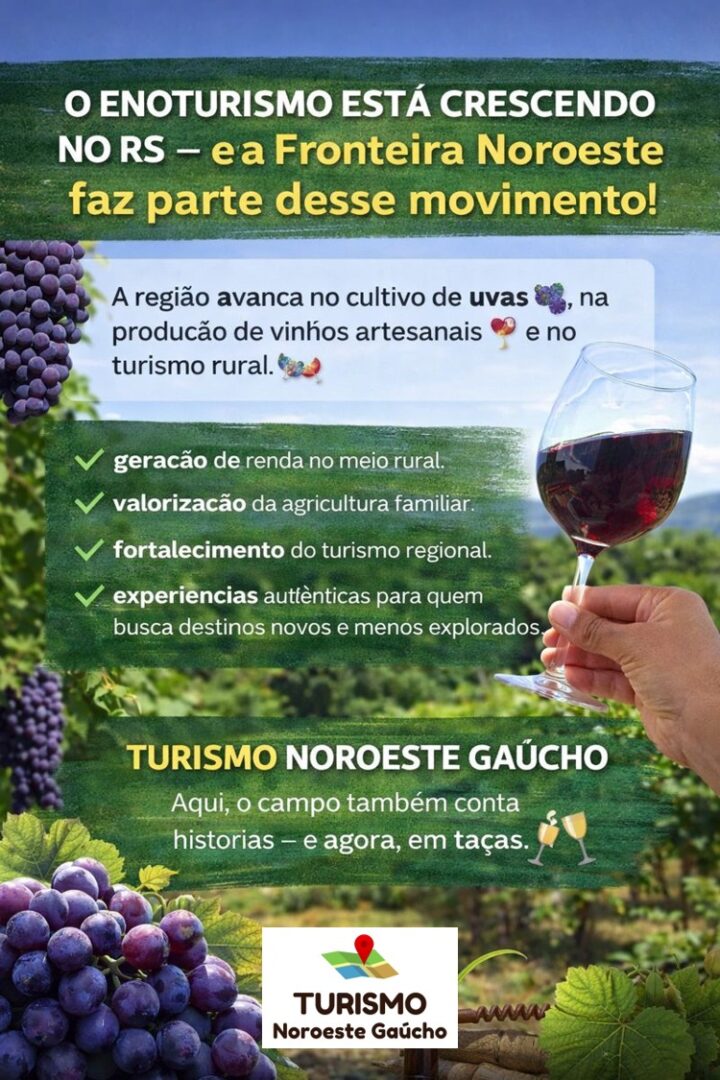 Esse crescimento fortalece ainda mais o turismo no Rio Grande do Sul e abre oportunidades importantes também para quem atua no enoturismo rural e nas rotas vinícolas de regiões como a Fronteira Noroeste do estado, onde nos últimos anos temos visto o avanço do cultivo de uvas, o surgimento de novas agroindústrias de vinhos artesanais e produtores apostando na diversificação da produção rural, unindo agricultura, turismo e identidade local.