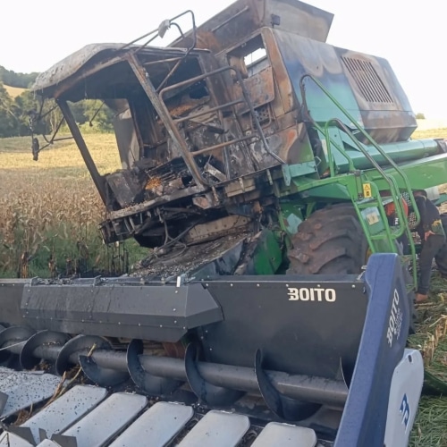 Ainda no domingo, em Três de Maio, o Corpo de Bombeiros combateu um incêndio em uma colheitadeira na localidade de Progresso. O equipamento era utilizado na colheita do milho e estava completamente tomado pelo fogo quando a equipe chegou ao local. O operador relatou suspeita de que o fogo tenha iniciado na parte traseira do motor, mas a causa não foi confirmada oficialmente. A colheitadeira também foi perdida.