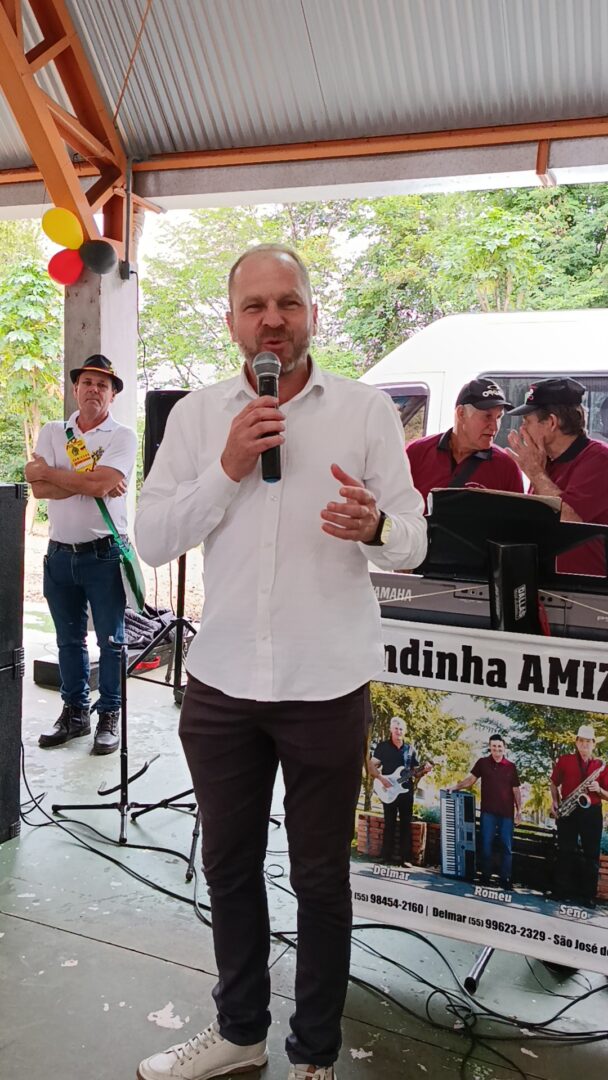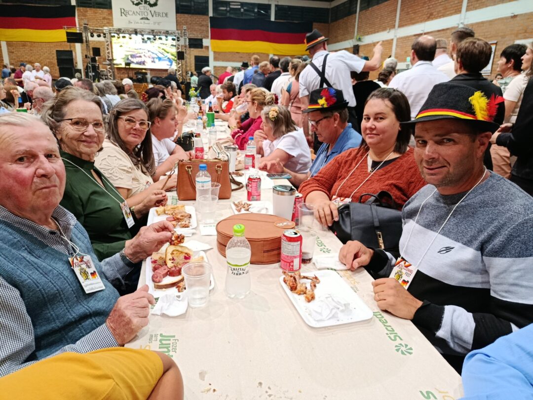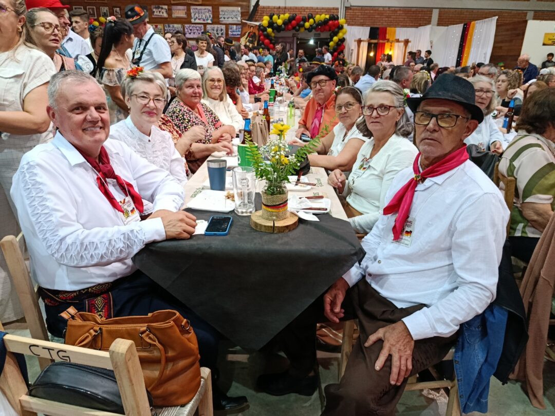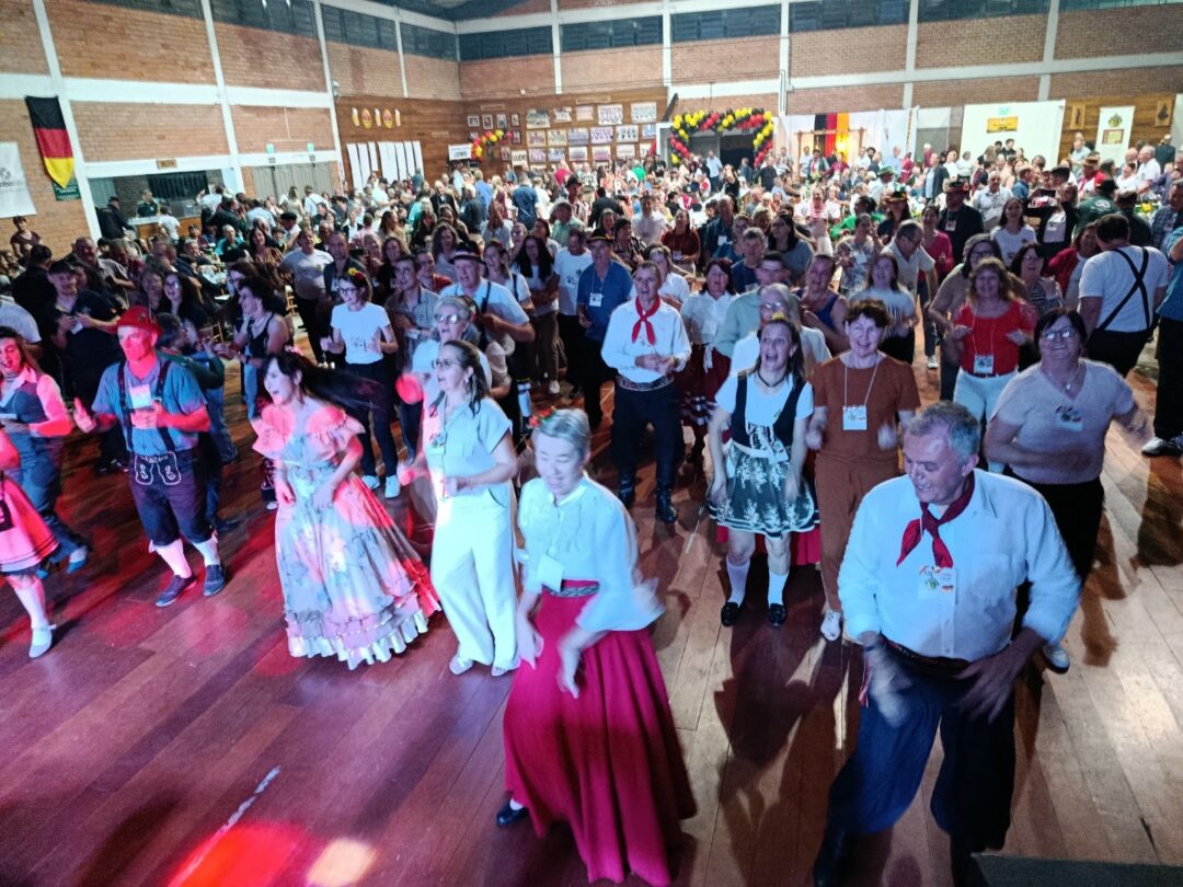 As atividades começaram no sábado à tarde, com uma animada recepção repleta de brincadeiras, música e muito chope, marcando o reencontro entre familiares e amigos. À noite, o público participou do tradicional Baile da Cuca e Linguiça, uma das atrações mais esperadas da festa, com muita dança e alegria.
