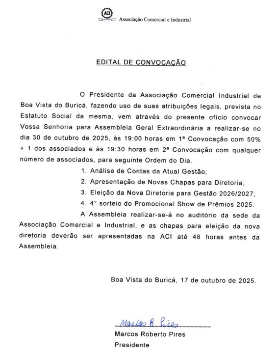 A Associação Comercial e Industrial de Boa Vista do Buricá (ACI) divulgou edital de convocação para Assembleia Geral Extraordinária, que ocorrerá na próxima quinta-feira, dia 30 de outubro de 2025, no auditório da sede da entidade.