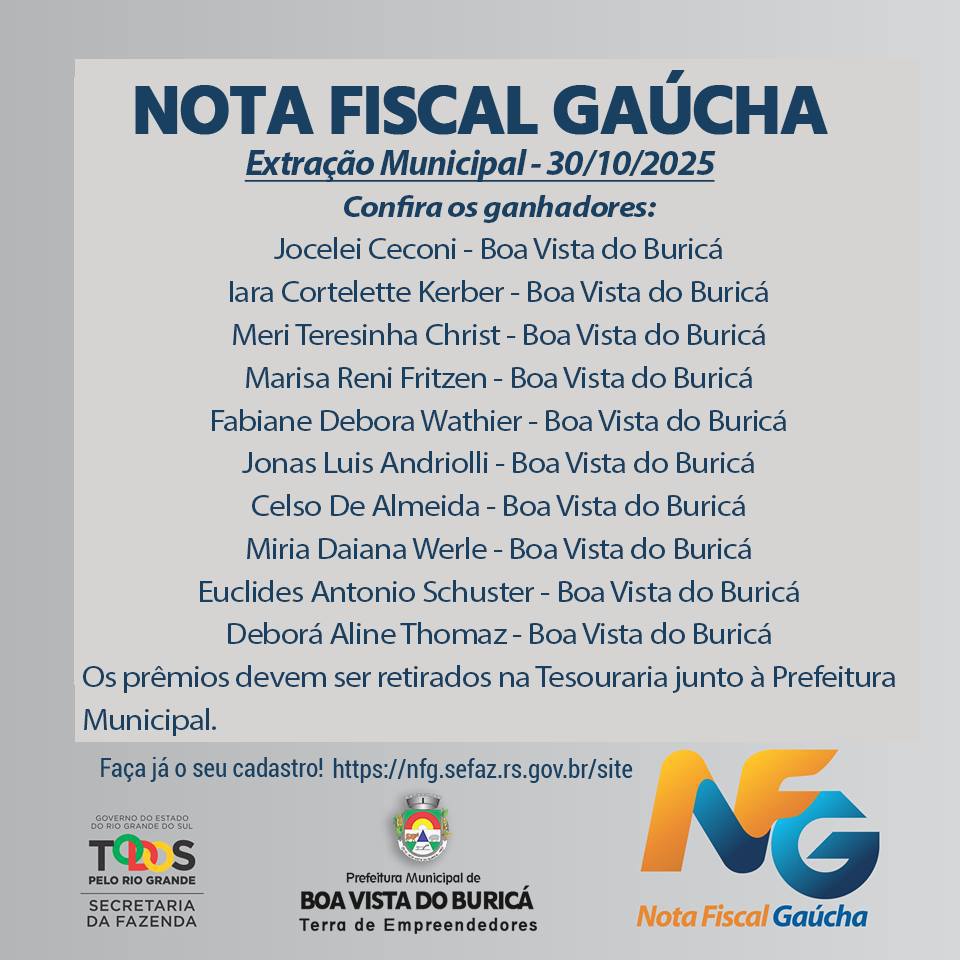 Confira os ganhadores da Nota Fiscal Gaúcha – Extração Municipal de Boa Vista do Buricá!