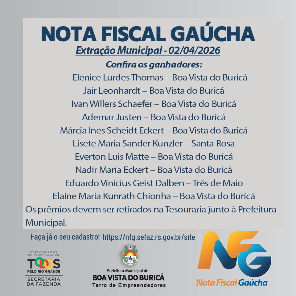 A mais recente extração municipal da Nota Fiscal Gaúcha, realizada no dia 02 de abril de 2026, teve forte presença de contemplados de Boa Vista do Buricá.