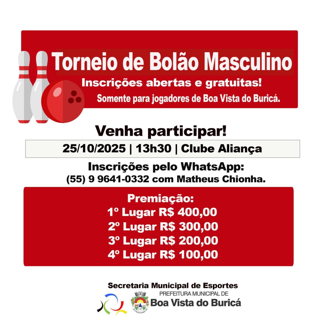 A Secretaria Municipal de Esportes convida os jogadores de Boa Vista do Buricá para participar do Torneio de Bolão Masculino, que acontece no dia 25 de outubro de 2025, a partir das 13h30, no Clube Aliança.