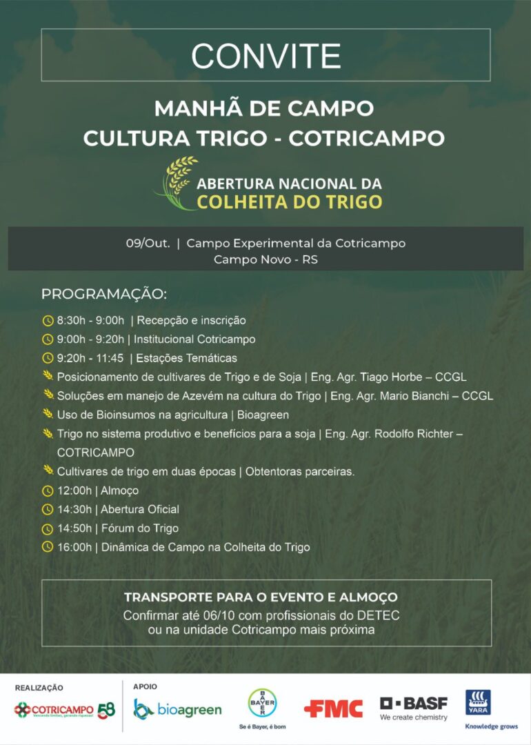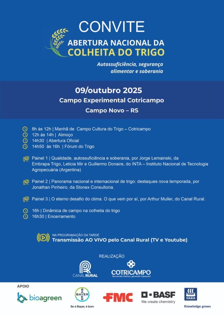 O evento acontecerá no dia 09 de outubro de 2025, no Campo Experimental da Cotricampo, em Campo Novo/RS, reunindo autoridades, pesquisadores, agricultores e lideranças do setor para debater qualidade, autossuficiência, soberania e o futuro da produção de trigo no país.