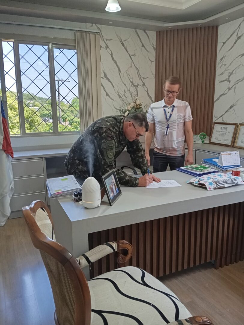 O Prefeito Ademir José Schneider foi oficialmente empossado como Presidente da Junta de Serviço Militar nº 133. A solenidade contou com a presença do 1° Ten QAO – Juliano Silva Tamiosso, Delegado do Serviço Militar do Posto de Recrutamento e Mobilização (PRM) de Santiago/RS, e do Soldado Andrey Cogo Teles.