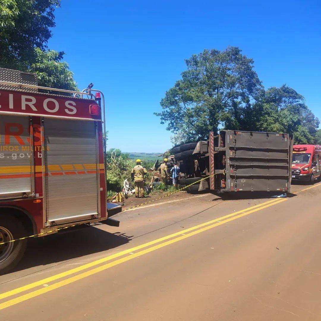 O acidente vitimou uma família de São Martinho, o impacto do acidente acabou tombando a carreta e jogando os veículos para fora da pista.