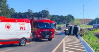 Carreta carregada de fumo tomba na BR-158 e bloqueia rodovia em Cunha Porã