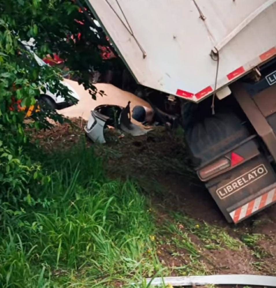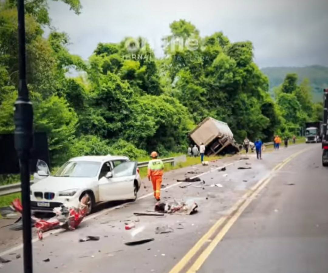 Segundo informações apuradas no local, uma das carretas envolvidas no acidente que estava carregada de trigo tombou sobre a HB20. O motorista da carreta não resistiu e faleceu no local. Na HB 20 duas pessoas ficaram presas nas ferragens e foram levadas ao Hospital Bruno Born para atendimento.
