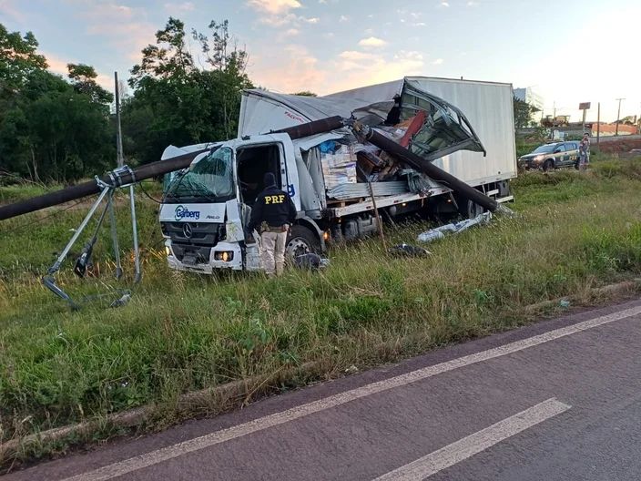 Ao sair da pista, o caminhão colidiu em um poste às margens da via. O motorista, ainda não identificado, morreu no local.